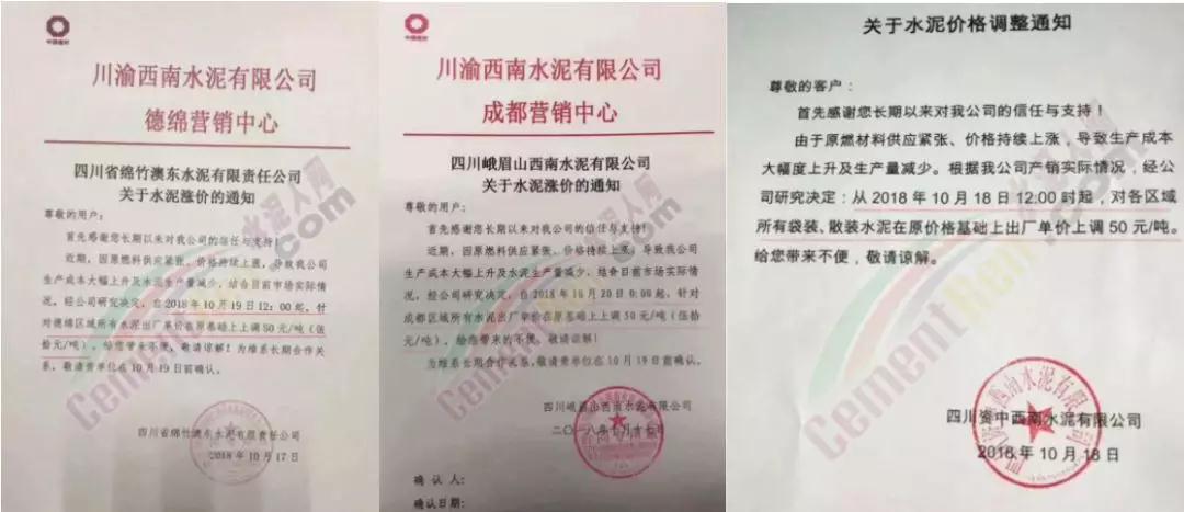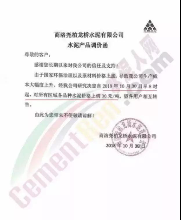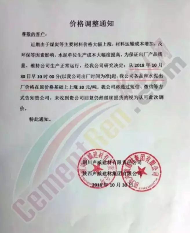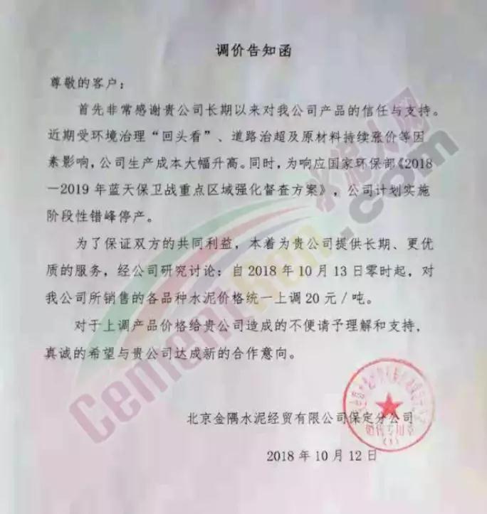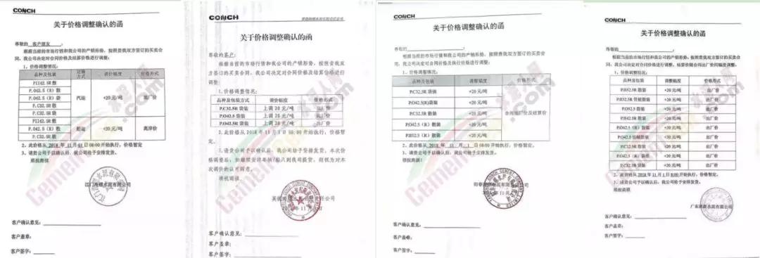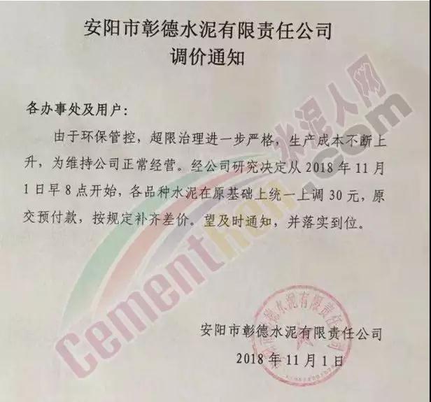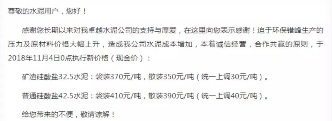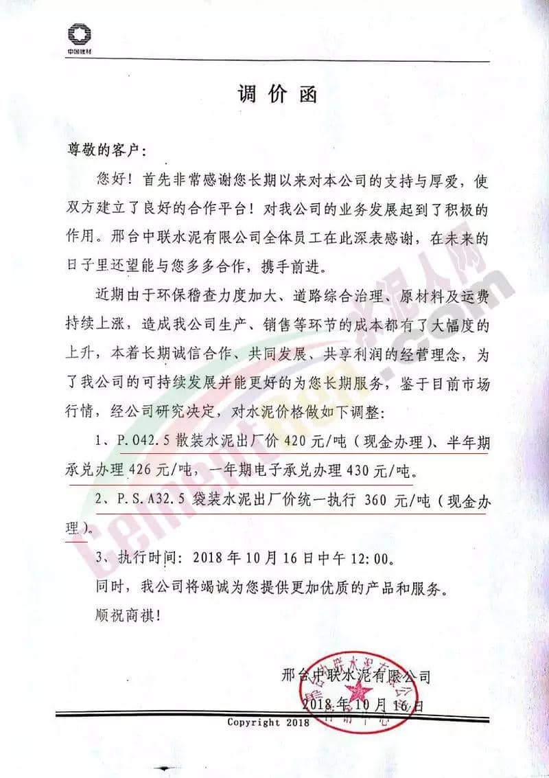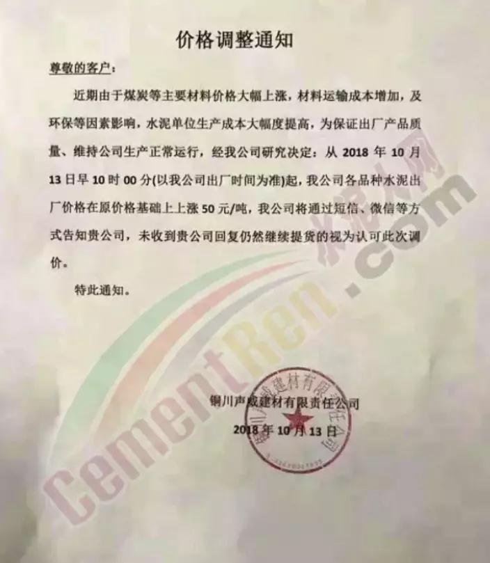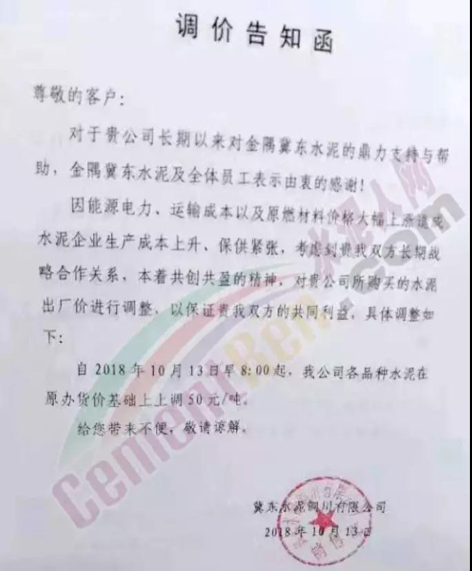 10月29日上海海螺水泥銷(xiāo)售有限公司發(fā)了一份南方水泥的漲價(jià)通知,漲價(jià)函稱(chēng)經(jīng)公司研究決定自10月29日零時(shí)開(kāi)始,公司從嘉善南方水泥發(fā)貨的42.5、52.5級(jí)水泥價(jià)格,在原價(jià)基礎(chǔ)上上調(diào)30元/噸。