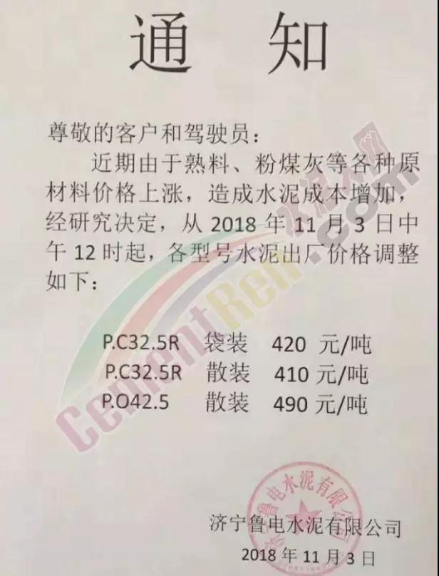 11月3日山西長(zhǎng)治市主導(dǎo)企業(yè)通知自11月4日凌晨起上調(diào)各標(biāo)號(hào)水泥價(jià)格,其中32.5級(jí)水泥上調(diào)30元/噸,42.5水泥上調(diào)40元/噸。調(diào)價(jià)通知如下: