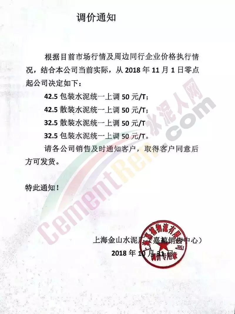 11月1日上海市主要品牌水泥發(fā)布調(diào)價(jià)通知,各標(biāo)號(hào)水泥價(jià)格上調(diào)50元/噸。