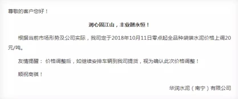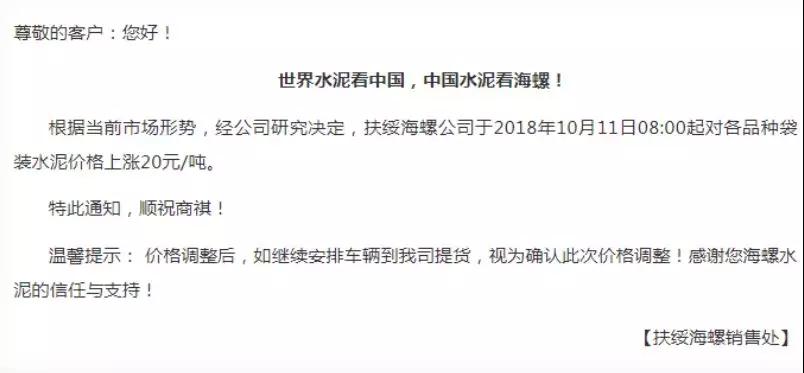 10月11日興業(yè)海螺、扶綏海螺、南寧紅獅、南寧華潤(rùn)、貴港臺(tái)泥等企業(yè)統(tǒng)一發(fā)布漲價(jià)通知,漲價(jià)幅度20元/噸。