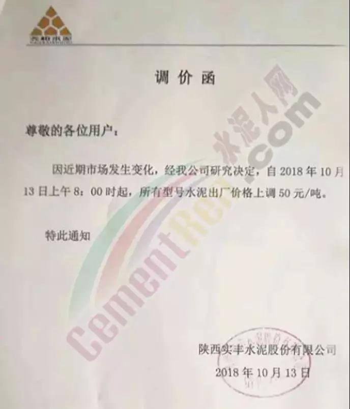 陜西關(guān)中區(qū)域水泥企業(yè)自10月以來(lái)已經(jīng)經(jīng)歷了至少兩次漲價(jià),10月13日關(guān)中區(qū)域的海螺水泥、堯柏水泥、冀東水泥等通知各標(biāo)號(hào)水泥在原價(jià)基礎(chǔ)上上調(diào)50元/噸。