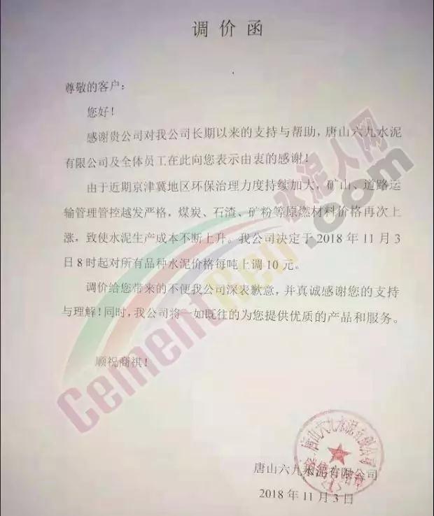 11月3日六九水泥發(fā)通知稱(chēng),由于近期京津冀地區(qū)環(huán)保治理力度持續(xù)加大,礦山、道路運(yùn)輸管理管控越發(fā)嚴(yán)格,煤炭、石渣、礦粉等原燃材料價(jià)格再次上漲,致使企業(yè)生產(chǎn)成本不斷上升,公司決定自11月3日起對(duì)所有品種水泥價(jià)格上調(diào)10元/噸。