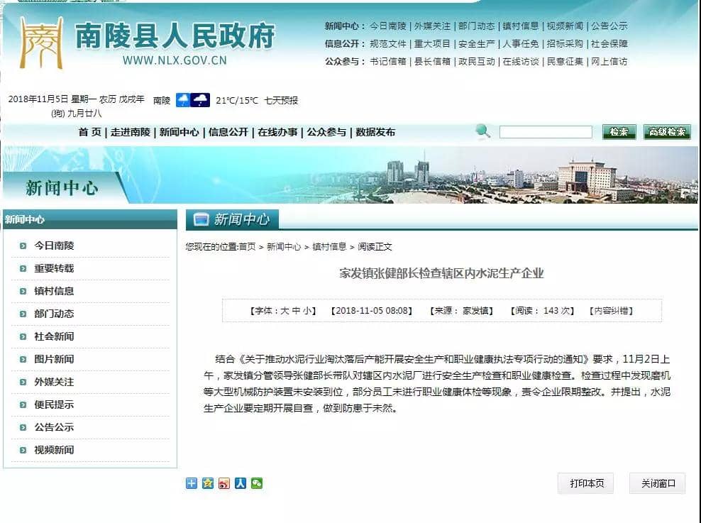 日前,安徽省蕪湖市南陵縣人民政府官網發(fā)布消息稱:結合《關于推動水泥行業(yè)淘汰落后產能開展安全生產和職業(yè)健康執(zhí)法專項行動的通知》要求,11月2日上午,南陵縣家發(fā)鎮(zhèn)分管領導張健部長帶隊對轄區(qū)內水泥廠進行安全生產檢查和職業(yè)健康檢查。