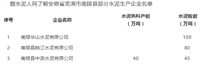 據(jù)水泥人網了解安徽省蕪湖市南陵縣部分水泥生產企業(yè)名單