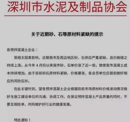 協(xié)會(huì)發(fā)文警示,砂石等原材料上漲近一倍