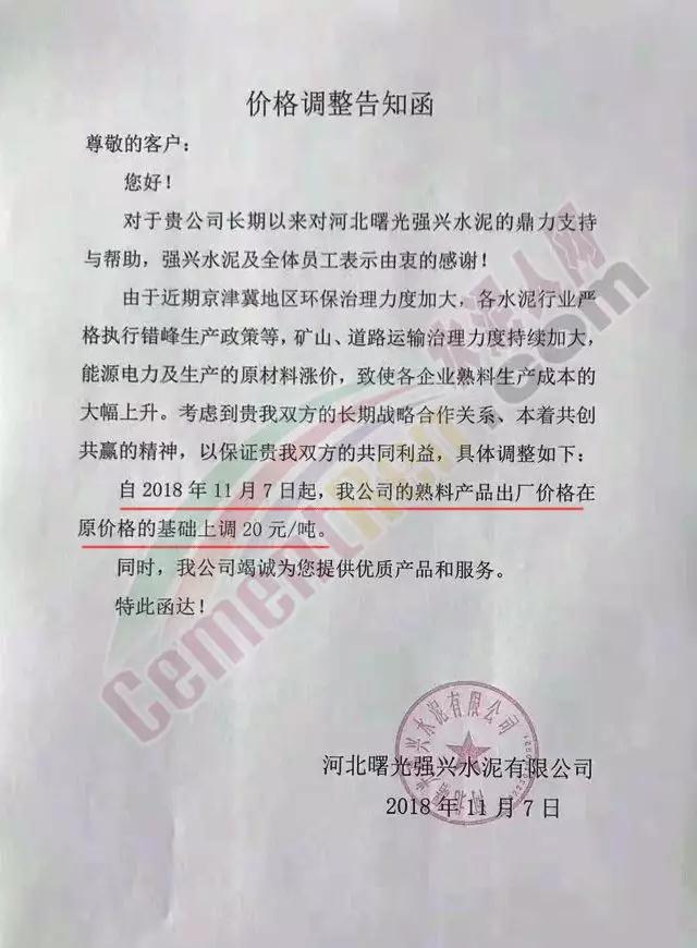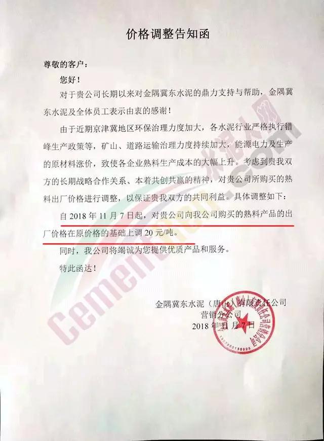 水泥人網通訊員消息:金隅冀東(唐山)有限責任公司營銷分公司、河北曙光強興水泥有限公司等企業(yè)于11月6日晚間發(fā)布《價格調整告知函》稱將于今日(11月7日)起,上調熟料出廠價,調價幅度20元/噸。 《價格調整告知函》稱,由于近期京津冀地區(qū)環(huán)保治理力度加大,各水泥行業(yè)嚴格執(zhí)行錯峰生產政策。礦山、道路運輸治理力度持續(xù)加大,能源電力及生產的原材料漲價,致使各企業(yè)熟料生產成本大幅上升。 因此上調熟料出廠價格。價格調整告知函原文如下: