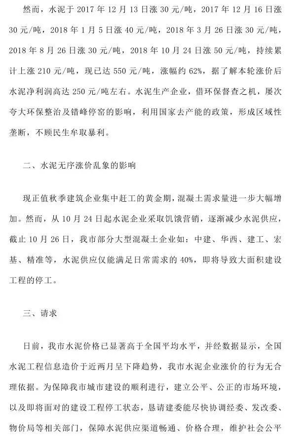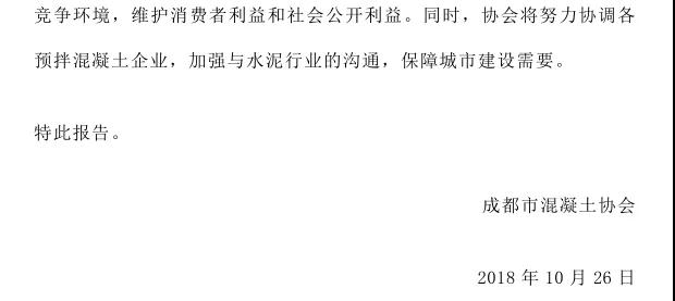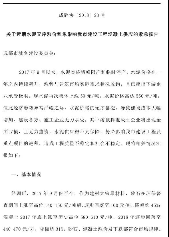 除此之外,成都市混凝土協(xié)會(huì)發(fā)布《關(guān)于近期水泥無序漲價(jià)亂象影響我市建設(shè)工程混凝土供應(yīng)的緊急報(bào)告》,該文件指出成都市水泥價(jià)格持續(xù)上漲,已經(jīng)嚴(yán)重影響到了民生,懇請(qǐng)建委能盡快協(xié)調(diào)經(jīng)委、發(fā)改委、物價(jià)局等相關(guān)部門,保障水泥供應(yīng)渠道暢通、價(jià)格合理,維護(hù)社會(huì)公平競(jìng)爭(zhēng)環(huán)境,維護(hù)消費(fèi)者利益和社會(huì)公開利益。