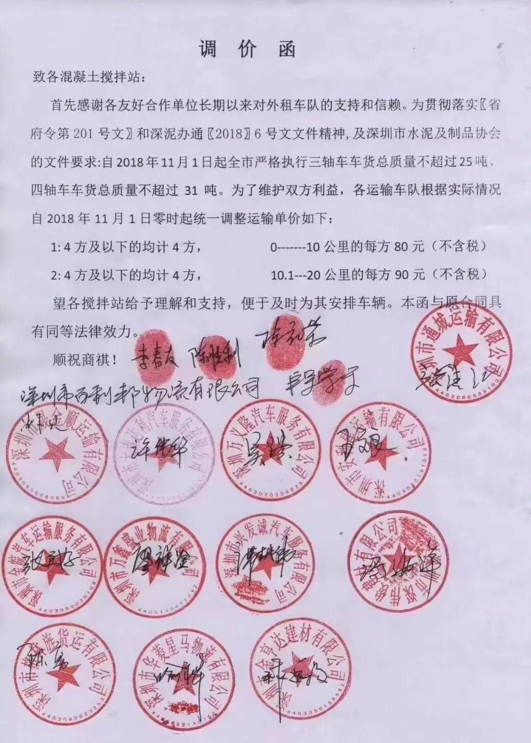 深圳市17家物流運(yùn)輸公司聯(lián)名發(fā)布漲價(jià)通知稱:因?yàn)槟壳吧钲谑袑?yán)格執(zhí)行三軸車車貨總質(zhì)量不超25噸、四軸車車貨總質(zhì)量不超31噸。因此,將運(yùn)輸單價(jià)做如下調(diào)整: