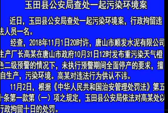 經(jīng)查,2018年11月1日20時許,玉田縣林西鎮(zhèn)唐山市順發(fā)水泥有限公司生產(chǎn)廠長高某在唐山市政府10月31日12時發(fā)布重污染天氣橙色二級預警的情況下,未執(zhí)行預警期間全面停產(chǎn)的要求,擅自生產(chǎn),污染環(huán)境。高某對違法行為供認不諱。