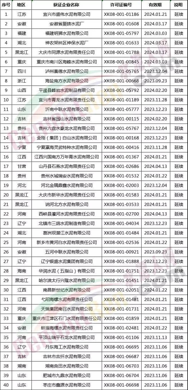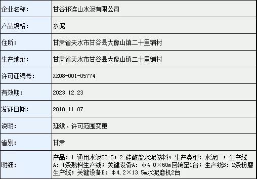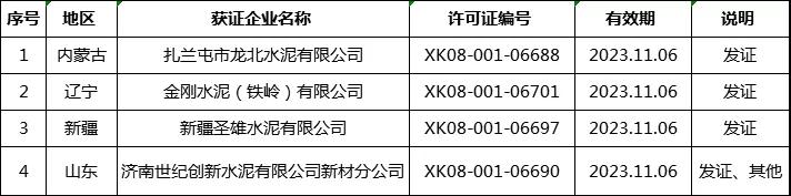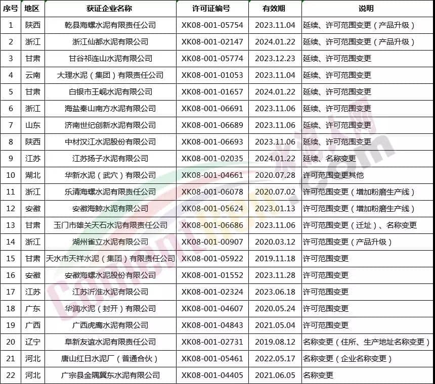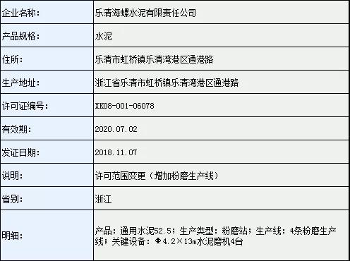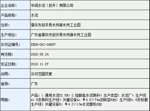 生產(chǎn)許可證變更中涉及多家水泥集團企業(yè)子公司,五家海螺水泥公司:安徽海螺水泥股份有限公司、樂清海螺水泥有限責(zé)任公司、乾縣海螺水泥有限責(zé)任公司;一家華潤水泥工廠華潤水泥(封開)有限公司;一家華新水泥工廠華新水泥(武穴)有限公司;一家金隅冀東工廠廣宗縣金隅冀東水泥有限公司;一家祁連山水泥甘谷祁連山水泥有限公司等。