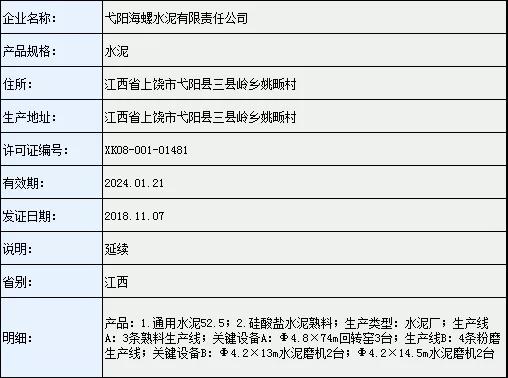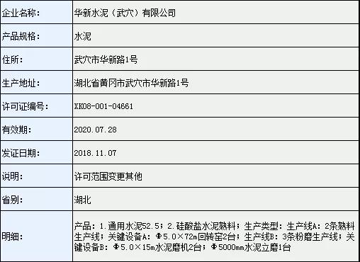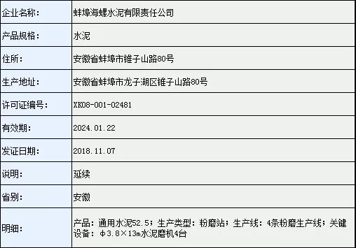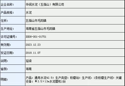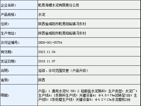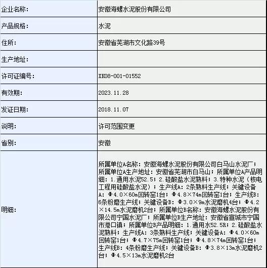 生產(chǎn)許可證變更中涉及多家水泥集團企業(yè)子公司,五家海螺水泥公司:安徽海螺水泥股份有限公司、樂清海螺水泥有限責(zé)任公司、乾縣海螺水泥有限責(zé)任公司;一家華潤水泥工廠華潤水泥(封開)有限公司;一家華新水泥工廠華新水泥(武穴)有限公司;一家金隅冀東工廠廣宗縣金隅冀東水泥有限公司;一家祁連山水泥甘谷祁連山水泥有限公司等。海螺水泥