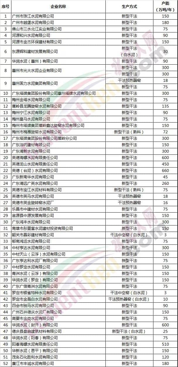 廣東省部分水泥企業(yè)名單