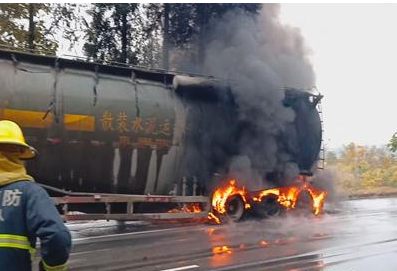 途中消防員迅速與報警人取得聯(lián)系,了解現(xiàn)場具體情況。經(jīng)了解,是從山東開往睢寧方向一輛運輸水泥的罐車著火。中隊抵達現(xiàn)場,迅速鋪設(shè)水帶出水滅火,經(jīng)過15分鐘左右的撲救明火被撲滅。據(jù)車主了解,是由于車子在行駛過程中爆胎引發(fā)起火的,主要燃燒部位為后輪胎。事故所幸沒有造成人員被困和受傷。
