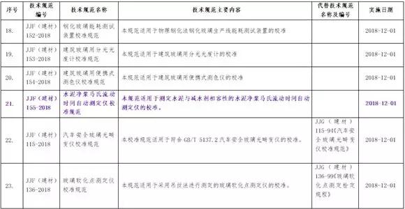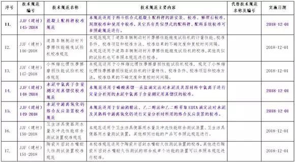 水泥行業(yè),編號(hào)JJF(建材)145-2018的混凝土配料秤校準(zhǔn)規(guī)范、編號(hào)JJF(建材)148-2018的水泥中氯離子含量測(cè)定用蒸餾儀校準(zhǔn)規(guī)范、編號(hào)JJF(建材)149-2018的水泥中游離氧化鈣絡(luò)合反應(yīng)裝置校準(zhǔn)規(guī)范、編號(hào)JJF(建材)155-2018的水泥凈漿馬氏流動(dòng)時(shí)間自動(dòng)測(cè)定儀校準(zhǔn)規(guī)范四項(xiàng)校準(zhǔn)規(guī)范被列入名單中,規(guī)范均從2018年12月1日起正式實(shí)施。