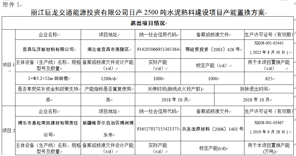 附件:1.麗江巨龍交通能源投資有限公司日產2500噸水泥熟料建設項目產能置換方案