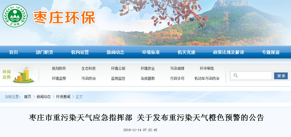 按照生態(tài)環(huán)境部統(tǒng)一部署,棗莊市重污染天氣應(yīng)急指揮部依據(jù)《棗莊市重污染天氣應(yīng)急預(yù)案(2018年修訂)》(棗氣綜指〔2018〕16號),于2018年11月14日7時(shí)發(fā)布重污染天氣橙色預(yù)警,定于2018年11月14日8時(shí)啟動重污染天氣Ⅱ級應(yīng)急響應(yīng)。