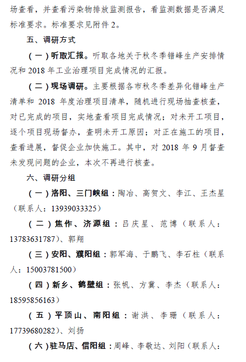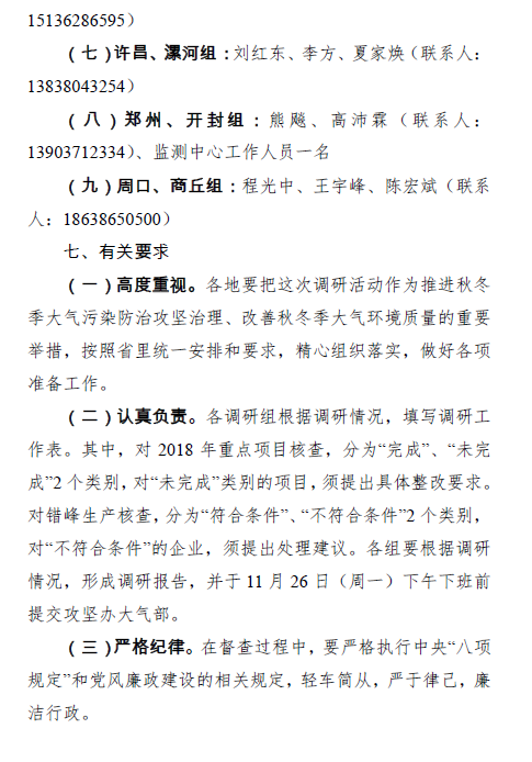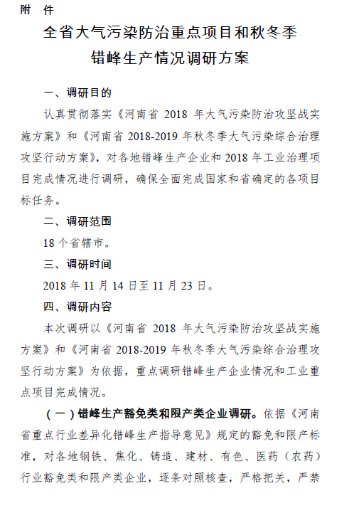 為深入貫徹黨中央、國務(wù)院和省委、省政府關(guān)于打贏藍天保衛(wèi)戰(zhàn)的決策部署,認真落實秋冬季大氣污染綜合治理攻堅各項措施,有效應(yīng)對秋冬季重污染天氣,省污染防治攻堅戰(zhàn)領(lǐng)導小組辦公室定于2018年11月14日至23日在全省組織開展大氣污染防治重點項目和秋冬季錯峰生產(chǎn)情況調(diào)研活動(方案見附件),請各地做好相關(guān)準備工作。