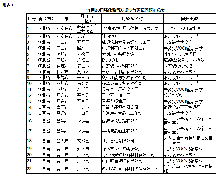 四、工業(yè)企業(yè)未安裝大氣污染防治設(shè)施問(wèn)題20個(gè)。