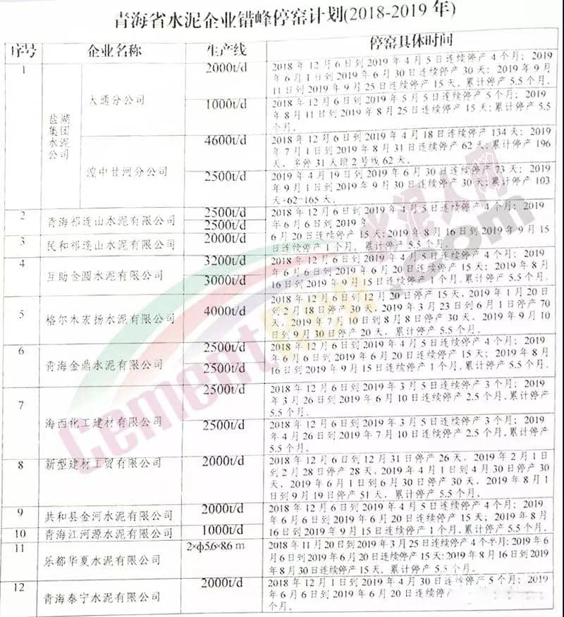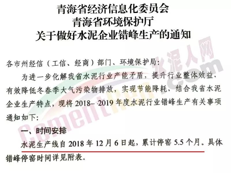 水泥人網(wǎng)最新消息,青海省經(jīng)信委、環(huán)保廳聯(lián)合發(fā)布《關(guān)于做好水泥企業(yè)錯峰生產(chǎn)的通知》要求,全省12戶水泥企業(yè)20臺水泥窯自2018年12月6日起,累計停窯5.5個月。全文如下: