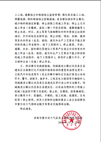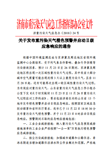 為有效應對重污染天氣,山東省重污染天氣應急工作小組辦公室下發(fā)《關于切實做好11月23日至11月26日重污染天氣過程應對工作的函》,要求包括濟南在內的山東省13個地市發(fā)布橙色預警并啟動Ⅱ級應急響應。按照國家區(qū)域應急聯(lián)動部署和省環(huán)保廳要求,濟南已于11月22日18時30分發(fā)布重污染天氣橙色預警,并于11月23日0時啟動Ⅱ級應急響應。