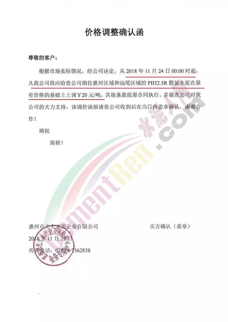 昨日(23日)惠州市光大水泥企業(yè)有限公司發(fā)布《價(jià)格調(diào)整確認(rèn)函》稱根據(jù)市場(chǎng)實(shí)際情況,經(jīng)公司決定從今日(24日)零時(shí)起,凡公司銷往惠州區(qū)域和汕尾區(qū)域的PII52.5R散裝水泥在原有價(jià)格的基礎(chǔ)上上調(diào)20元/噸。