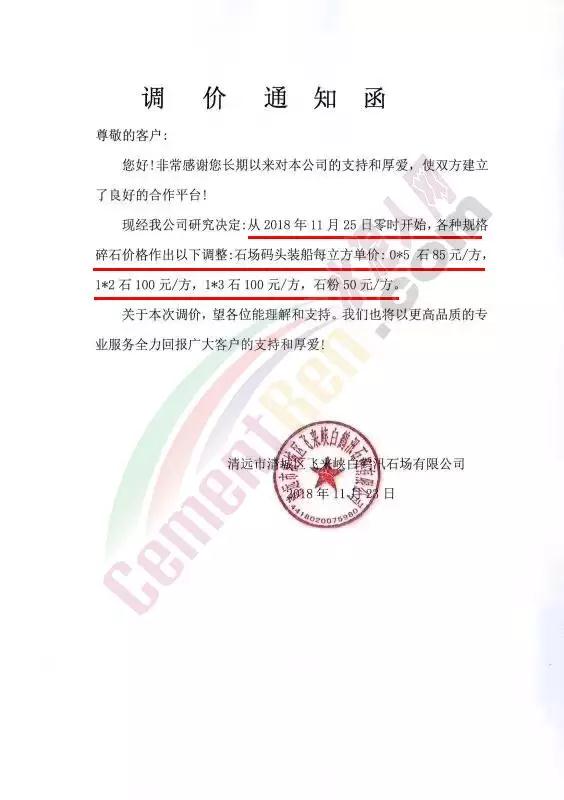 珠三角區(qū)域不僅僅是熟料和水泥供應(yīng)緊張,近期混合材和石子市場(chǎng)也出現(xiàn)緊俏行情。昨日(23日)清遠(yuǎn)市清城區(qū)飛來峽白鶴汛石場(chǎng)有限公司發(fā)調(diào)價(jià)通知函稱,從11月25日開始對(duì)各規(guī)格碎石價(jià)格作出調(diào)整。
