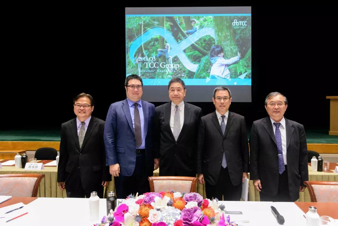 臺(tái)泥董事長張安平(中)與集團(tuán)企業(yè)中橡、信昌化董事長辜公怡(左二)、臺(tái)泥總經(jīng)理李鐘培(右二)、信昌化總經(jīng)理趙天福(右一)及中橡總經(jīng)理黃柏松(左一)一起參加法說會(huì)