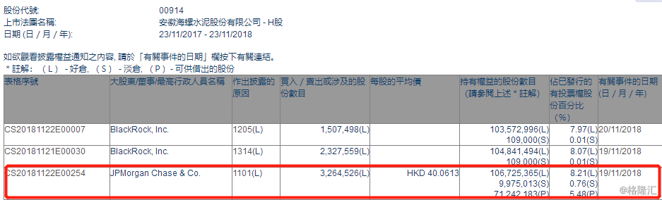 格隆匯獲悉,根據(jù)港交所最新權(quán)益披露資料顯示,2018年11月19日,海螺水泥獲JP Morgan Chase & Co.場內(nèi)以每股均價(jià)40.0613港元,增持326.45萬股,總價(jià)約1.31億港元。
