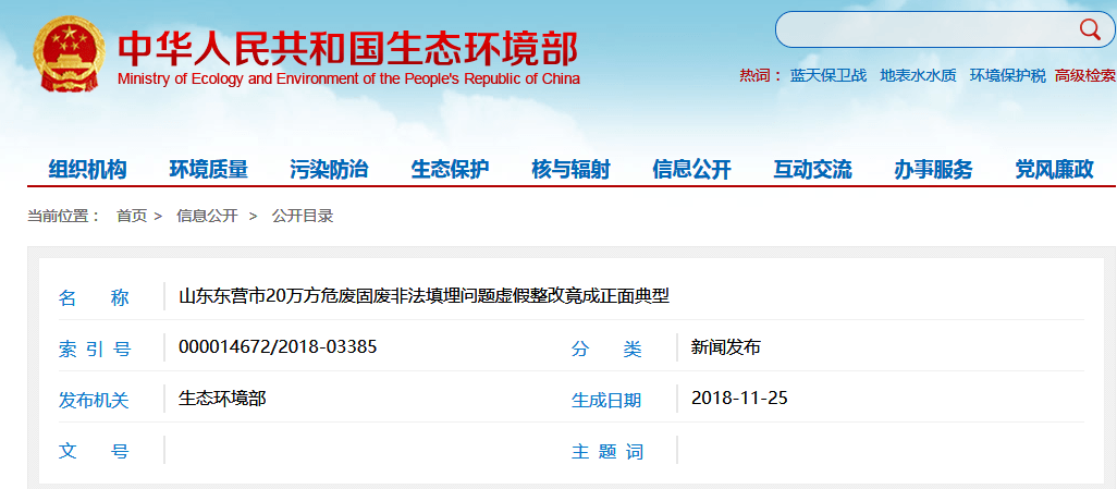 2018年11月15日,中央第三生態(tài)環(huán)境保護(hù)督察組對(duì)第一輪中央環(huán)保督察交辦問(wèn)題查處情況開(kāi)展抽查,發(fā)現(xiàn)山東省東營(yíng)市廣饒縣對(duì)交辦問(wèn)題查處不力,對(duì)近20萬(wàn)立方米混有危險(xiǎn)廢物的垃圾簡(jiǎn)單覆土掩埋后,便通過(guò)媒體向社會(huì)宣布整改到位,虛假整改問(wèn)題突出。