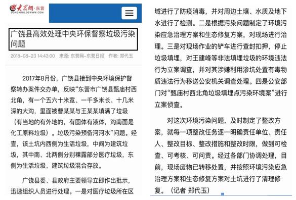 2017年8月,中央第三環(huán)境保護(hù)督察組多次接到群眾舉報(bào),反映東營(yíng)市廣饒縣甄廟村土坑非法填埋大量化工廢液、醫(yī)療垃圾、生活垃圾等,嚴(yán)重污染周邊環(huán)境。東營(yíng)市在調(diào)查后,向督察組反饋稱(chēng),廣饒縣組織相關(guān)部門(mén)開(kāi)展了調(diào)查,共清運(yùn)77.95噸醫(yī)療廢物和400余噸生活垃圾。2018年6月15日,廣饒縣公示交辦問(wèn)題已完成整改并銷(xiāo)號(hào),《東營(yíng)日?qǐng)?bào)》也對(duì)有關(guān)情況進(jìn)行了宣傳報(bào)道。