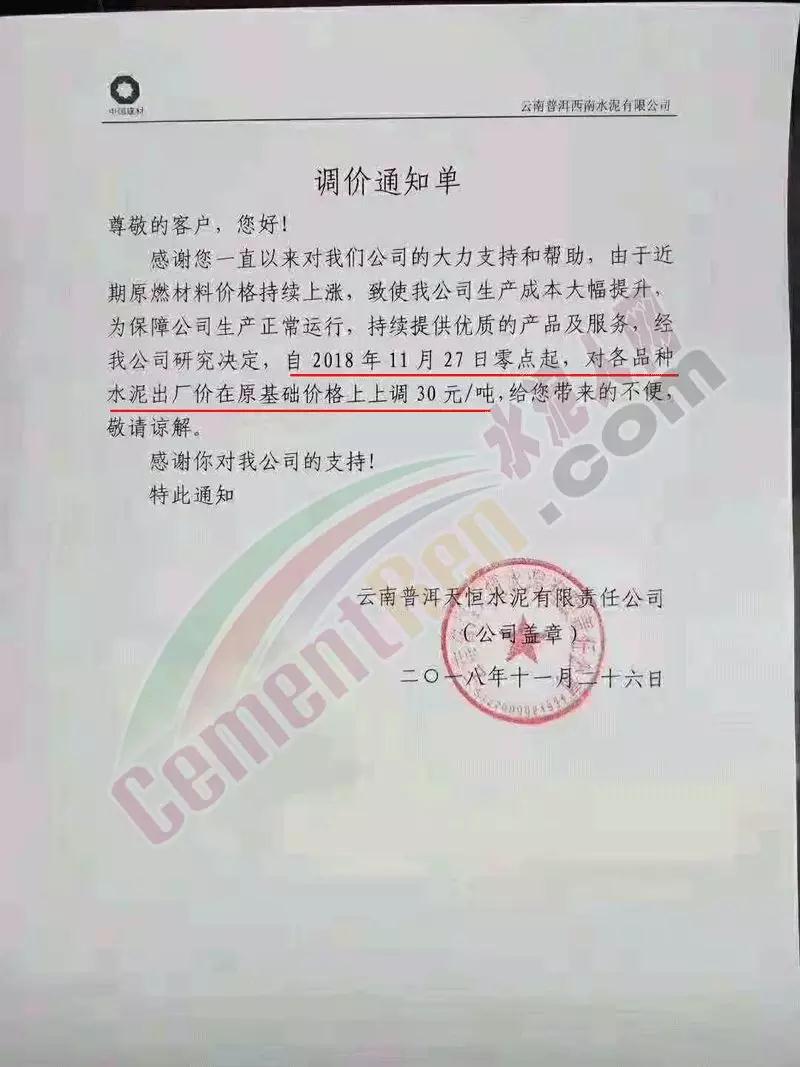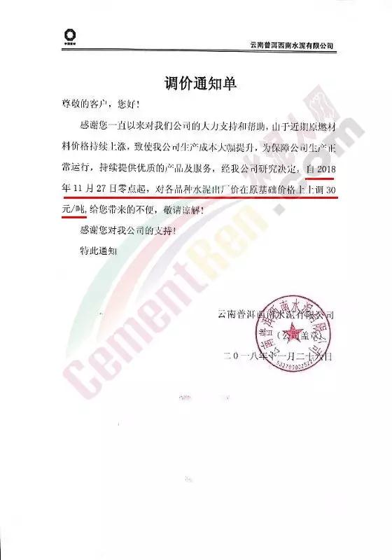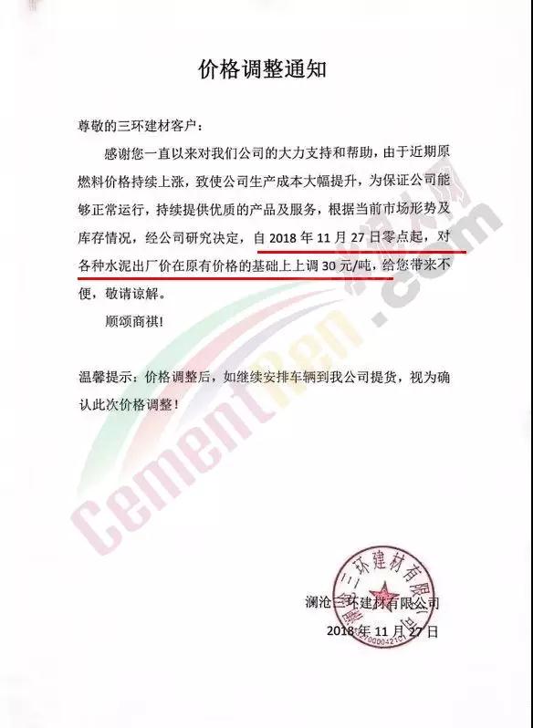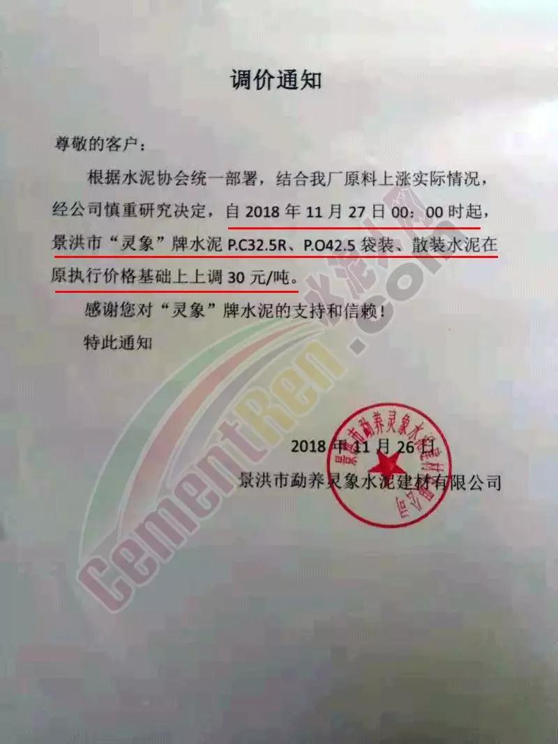 同期云南瀾滄三環(huán)建材有限公司和景洪市勐養(yǎng)靈象水泥建材有限公司也同步上調(diào)了水泥價(jià)格。調(diào)價(jià)通知如下: