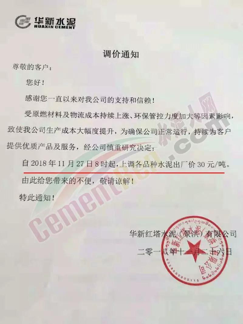 華新紅塔水泥(景洪)有限公司調(diào)價(jià)通知稱,受原燃材料及物流成本持續(xù)上漲,環(huán)保管控力度加大等因素影響,致使公司生產(chǎn)成本大幅提升,為確保公司正常運(yùn)行,持續(xù)為客戶提供 優(yōu)質(zhì)產(chǎn)品及服務(wù),經(jīng)公司慎重研究決定 :自今日(27日)8時(shí)起,上調(diào)各品種水泥出廠價(jià)30元/噸。