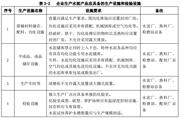 第七條 企業(yè)生產(chǎn)水泥產(chǎn)品應(yīng)具備本條款規(guī)定的基本生產(chǎn)條件,內(nèi)容包括:生產(chǎn)設(shè)施和檢驗設(shè)施、生產(chǎn)設(shè)備和檢驗設(shè)備,具體要求見表3-2至表3-4。
