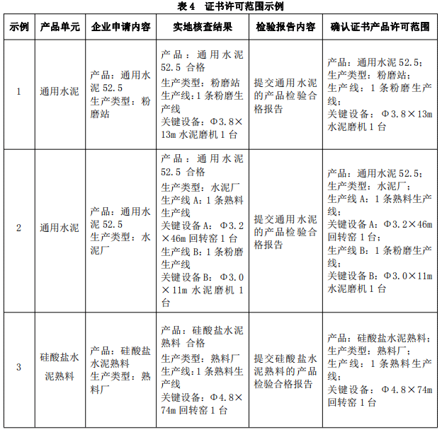 水泥產(chǎn)品生產(chǎn)許可證證書許可范圍示例如表4。