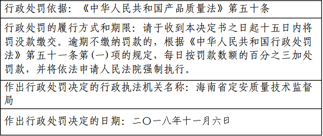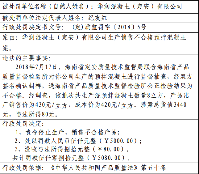 11月28日,海南省定安質量技術監(jiān)督局發(fā)布五起2018年行政處罰案件,具體為海南海鑫隆塑膠制品有限公司無證生產不合格食品相關產品塑料飲料瓶被罰款46500元;海南銘傳塑膠有限公司定安分公司無證生產不合格食品相關產品塑料飲料瓶被罰款36000元;定安龍河培曹木材加工廠生產銷售不合格混凝土模板用膠合板被罰款1000元;華潤混凝土(定安)有限公司生產銷售不合格預拌混凝土被罰款5000元;定安雷鳴宏發(fā)環(huán)保磚廠生產銷售不合格混凝土實心磚被罰款2170元。