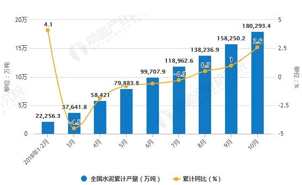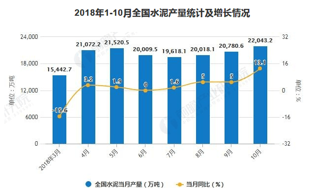 2018年1-10月全國水泥產(chǎn)量統(tǒng)計及增長情況