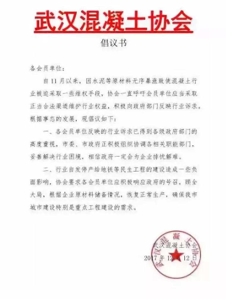 同期湖北武漢混凝土協(xié)會發(fā)出倡議書稱,因水泥等原材料無序暴漲致使混凝土行業(yè)采取一些維權手段,武漢混凝土協(xié)會一直呼吁會員單位應當采取正當合法渠道維護行業(yè)權益,積極向政府部門反映行業(yè)訴求。
