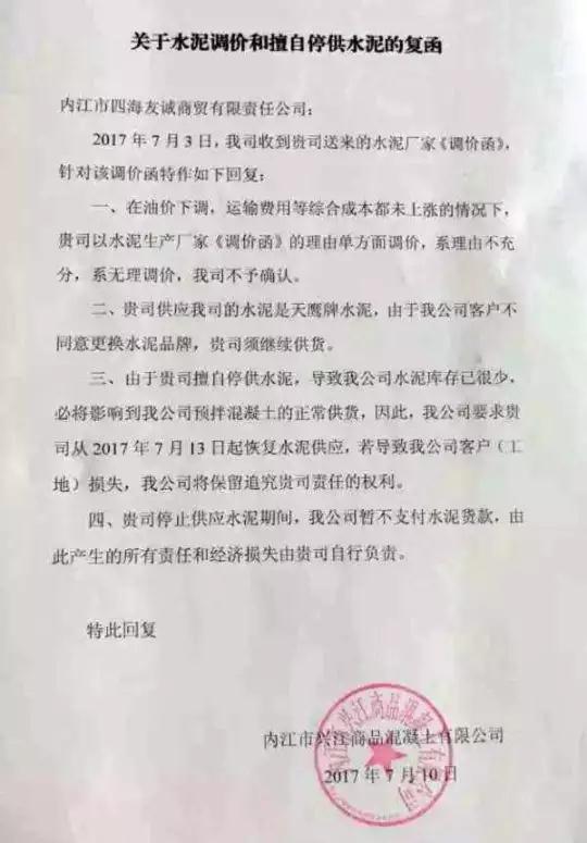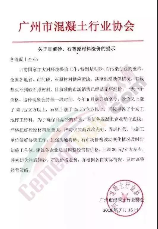 信件指出,“水泥企業(yè)無序漲價,引發(fā)市場混亂”,“且告知混凝土企業(yè),如不在漲價函上簽字確認,將予以停止水泥供應,此舉還從側面引發(fā)了預拌混凝土其他原材料(如粉煤灰、礦粉等)的漲價趨勢,對本來已經岌岌可危的混凝土企業(yè)造成致命一擊。”
