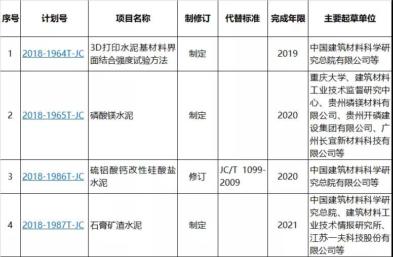 備注:上述項目主管部門均屬工信部原材料工業(yè)司。技術委員會或技術歸口單位均為全國水泥標準化技術委員會。標準性質均為推薦。