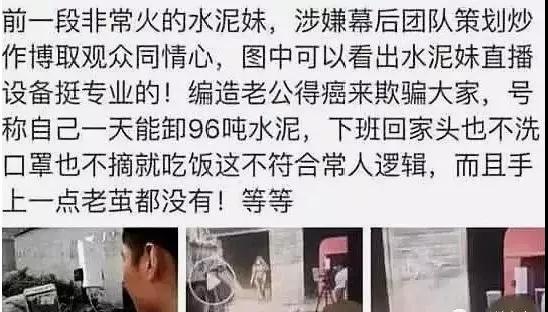 我們總是能在直播的屏幕上看見(jiàn)一個(gè)相貌還算清秀的女子,渾身都是水泥灰臉上頭發(fā)上手上沒(méi)有一點(diǎn)干凈的地方,而且她總是假裝自己堅(jiān)強(qiáng)的去抬水泥,在拍攝的過(guò)程中她一直對(duì)觀眾講:自己的母親年紀(jì)大了而且生病了一直就躺在床上,自己的老公也得了癌癥,她為了照顧生病的母親給母親和老公掙夠治病的錢(qián),每天不得不抬很多包水泥,她在直播中說(shuō)自己一天能抬96噸水泥。直播團(tuán)隊(duì)依此來(lái)博取觀眾的同情讓觀眾給他們打賞。