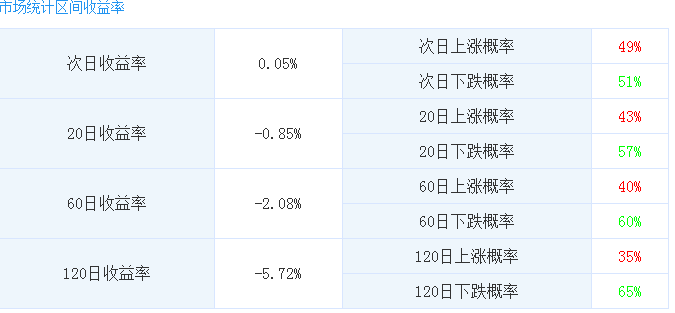 統(tǒng)計(jì)2016年2月1日至2018年5月31日的全市場數(shù)據(jù),東方財(cái)富Choice數(shù)據(jù)顯示,共有2741只個股有效突破年線9374次,其中4590次突破后次日股價(jià)上漲,4784次股價(jià)下跌,全市場次日平均收益率為0.05%。若將持有期拉長,一個月(20日)、三個月(60日)、六個月(120日)平均收益率分別為-0.85%、-2.08%、-5.72%。