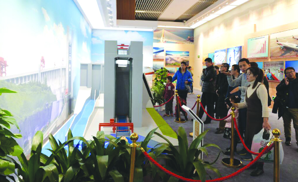 圖為觀眾在三峽升船機(jī)模型旁駐足觀看