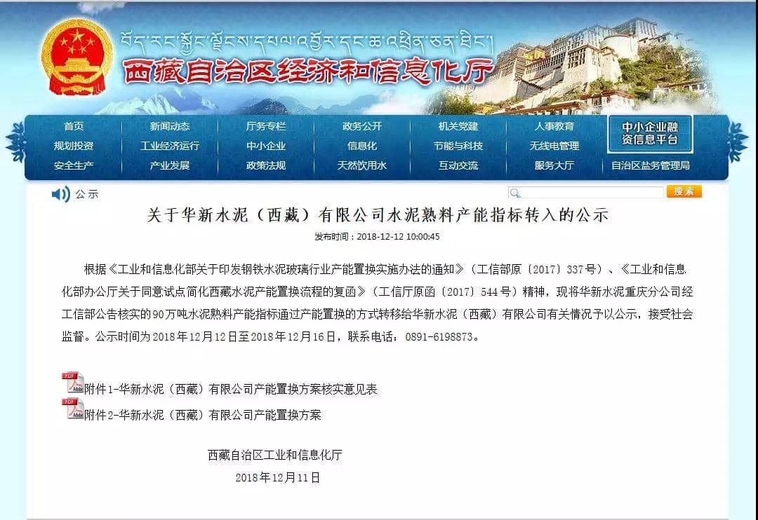 日前,西藏自治區(qū)工業(yè)和信息化廳發(fā)布《關(guān)于華新水泥(西藏)有限公司水泥熟料產(chǎn)能指標(biāo)轉(zhuǎn)入的公示 》,公示稱:根據(jù)《工業(yè)和信息化部關(guān)于印發(fā)鋼鐵水泥玻璃行業(yè)產(chǎn)能置換實(shí)施辦法的通知》(工信部原〔2017〕337號(hào))、《工業(yè)和信息化部辦公廳關(guān)于同意試點(diǎn)簡(jiǎn)化西藏水泥產(chǎn)能置換流程的復(fù)函》(工信廳原函〔2017〕544號(hào))精神,現(xiàn)將華新水泥重慶分公司經(jīng)工信部公告核實(shí)的90萬(wàn)噸水泥熟料產(chǎn)能指標(biāo)通過(guò)產(chǎn)能置換的方式轉(zhuǎn)移給華新水泥(西藏)有限公司有關(guān)情況予以公示,接受社會(huì)監(jiān)督。公示時(shí)間為2018年12月12日至2018年12月16日,聯(lián)系電話:0891-6198873。
