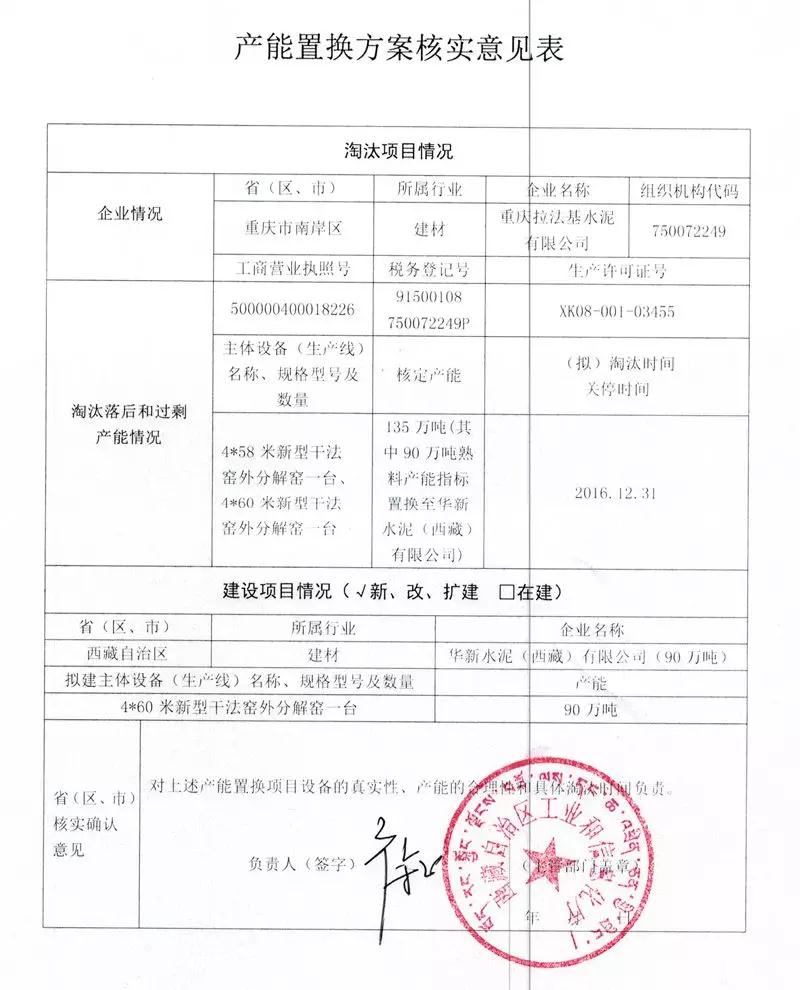 華新水泥(西藏)有限公司產(chǎn)能置換方案核實(shí)意見表