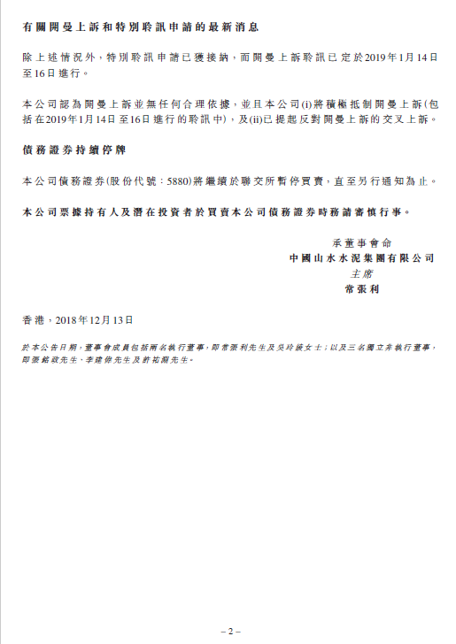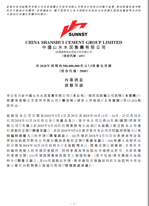 山水水泥(00691.HK)公告, 特別聆訊申請已獲接納,而開曼上訴聆訊已定于2019年1月14日至16日進行。公司認為開曼上訴并無任何合理依據(jù),并且公司將積極抵制開曼上訴(包括在2019年1月14日至16日進行的聆訊中),已提起反對開曼上訴的交叉上訴。債務證券持續(xù)停牌。