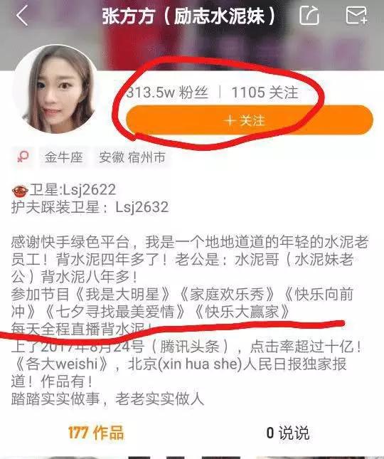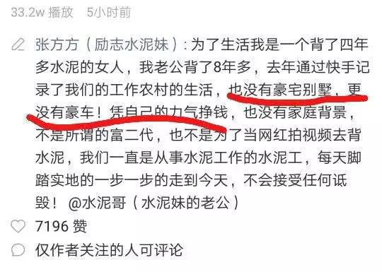 也沒有網(wǎng)上說的那些豪宅豪車,只是一個普通人而已。說她自己的工作就是搬水泥,已經(jīng)背了四年多了,她的老公背了八年多了,只不過去年才通過快手發(fā)出來而已。