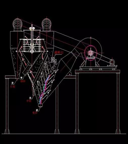 吉能達公司將V型選粉機和自主研發(fā)的三分離選粉機有機的結(jié)合,研制出復(fù)合式機制砂風(fēng)選脫粉機,該產(chǎn)品已獲得江蘇省科技廳高新技術(shù)產(chǎn)品認(rèn)定,被國家科技部列為機制砂風(fēng)選脫粉產(chǎn)業(yè)化創(chuàng)新項目。該產(chǎn)品利用V型選粉機將4.75~2.37mm的粗顆粒率先分離出來,粗顆粒可再回制砂機繼續(xù)制砂,也可作為成品出售,中砂和細(xì)砂通過V后被上部的籠型轉(zhuǎn)子分離出來,0.075mm的細(xì)粉則被旋風(fēng)筒收集下來,從而實現(xiàn)脫粉的目的。