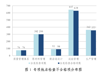 三季度專項(xiàng)執(zhí)法檢查內(nèi)容包括:預(yù)拌混凝土企業(yè)的質(zhì)量管理體系、原材料管理、配合比設(shè)計(jì)、試驗(yàn)管理、生產(chǎn)管理等方面,共計(jì)檢查預(yù)拌混凝土企業(yè)34家次,1478項(xiàng)次,其中合格1450項(xiàng),合格率為98.1%,不合格項(xiàng)主要出現(xiàn)在試驗(yàn)管理方面,具體情況見(jiàn)圖1。在執(zhí)法檢查的同時(shí)對(duì)預(yù)拌混凝土試塊(拌合物)、原材料進(jìn)行了抽檢,其中抽檢混凝土試塊(拌合物)115組,合格113組,合格率為98.3%,預(yù)拌混凝土出廠質(zhì)量良好;抽檢原材料67組,全部合格??傮w來(lái)看,我市預(yù)拌混凝土質(zhì)量整體穩(wěn)定可靠。