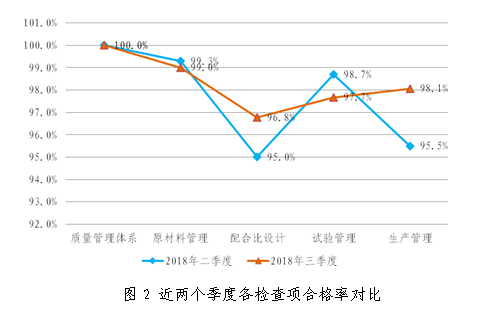 與二季度相比,原材料管理合格率下降0.3個(gè)百分點(diǎn),配合比設(shè)計(jì)合格率提升1.8個(gè)百分點(diǎn),試驗(yàn)管理合格率下降1個(gè)百分點(diǎn),生產(chǎn)管理合格率提升2.6個(gè)百分點(diǎn),具體情況見(jiàn)圖2。