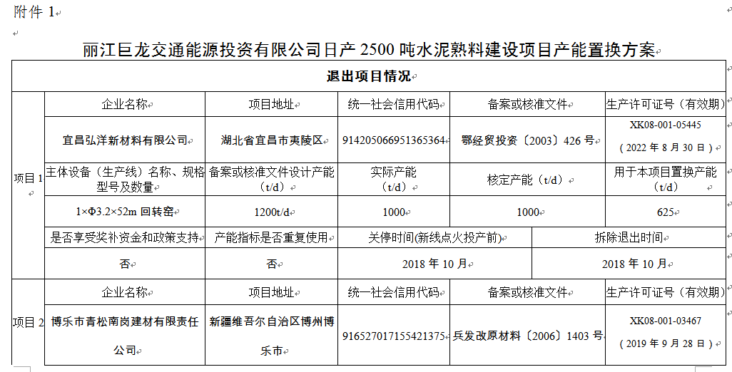 附件:1.麗江巨龍交通能源投資有限公司日產(chǎn)2500噸水泥熟料建設(shè)項(xiàng)目產(chǎn)能置換方案